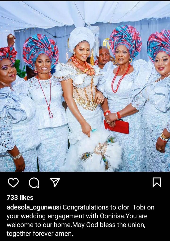 Reacting, Adesola took to her Instagram page to share photos of Ronke and Tobi, as she welcomed them to their family and also prayed for their union.