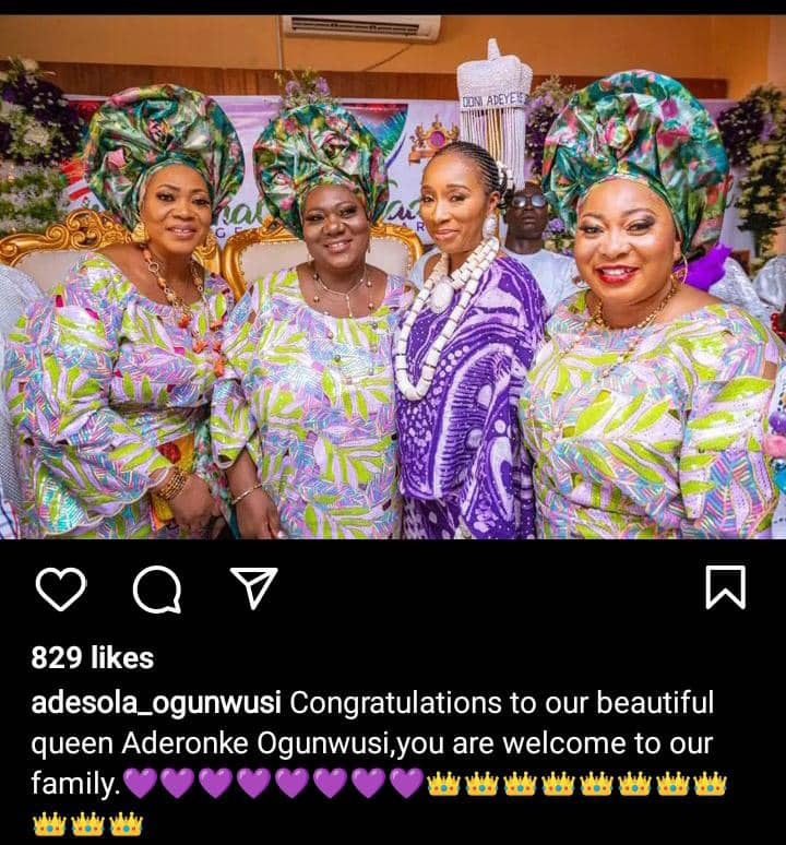 She wrote: “Congratulations to our beautiful queen Aderonke Ogunwusi,you are welcome to our family”