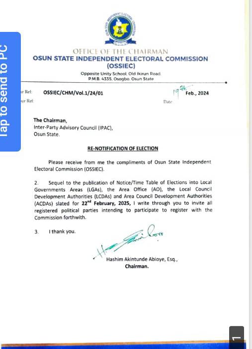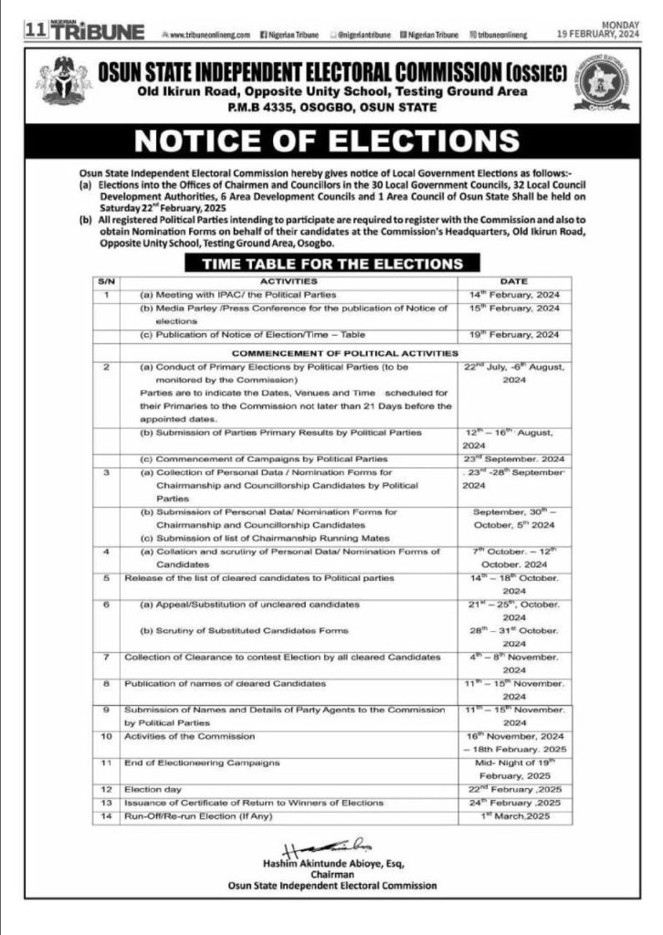 The Osun State Independent Electoral Commission, OSSIEC, has released the timetable for the February 2025 council poll.