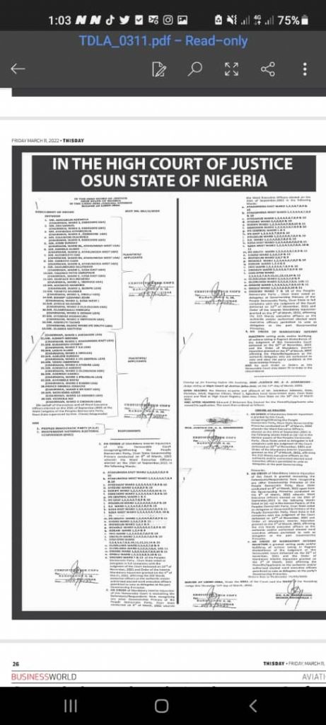 Besides, the court granted an Order of Mandatory Interim Injunction restraining the defendants/respondents from recognizing any other governorship primaries of the PDP in Osun State aside the one that saw to the emergence of Babayemi.
