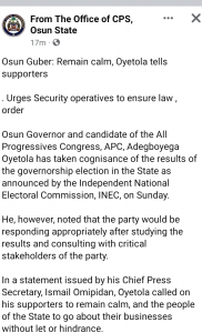 In a statement issued by his Chief Press Secretary, Ismail Omipidan, Oyetola called on his supporters to remain calm, and the people of the State to go about their businesses without let or hindrance.
