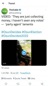 VIDEO: 'They are just collecting money, I haven't seen any votes' — 'party agent' laments#OsunDecides #OsunElection #OsunDecides2022 pic.twitter.com/vKAMCjt3tk