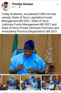 According to the statement, “Today at plenary, we passed 3 bills into law namely; State of Osun Legislative Funds Management Bill 2021, State of Osun Judiciary Funds Management Bill 2021 and State of Osun Private Veterinary Premises and Ambulatory Practice (Registration) Bill 2021.”