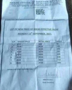 AMILOADED reports that the previous price of N80 bread will now be sold to consumers at N120, previous price of N120 bread will now be sold to consumers at N150, previous price of N200 bread will now be sold at N250.