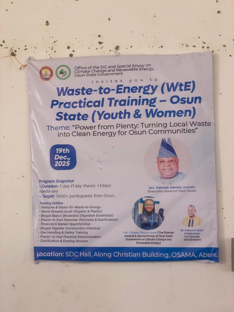 The Osun State Government has trained youths and women across the state on waste-to-energy conversion as part of efforts to promote income generation and environmental sustainability.