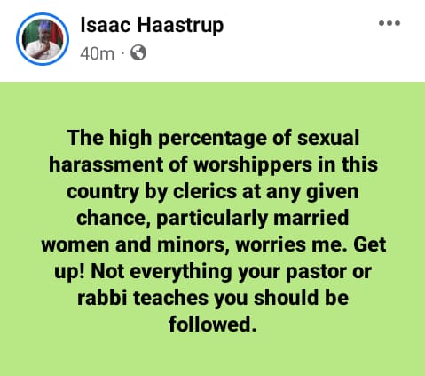 “The high percentage of sexual harassment of worshippers in this country by clerics at any given chance, particularly married women and minors, worries me. Get up! Not everything your pastor or rabbi teaches you should be followed,” he wrote in a Facebook post on Friday, March 31, 2023.