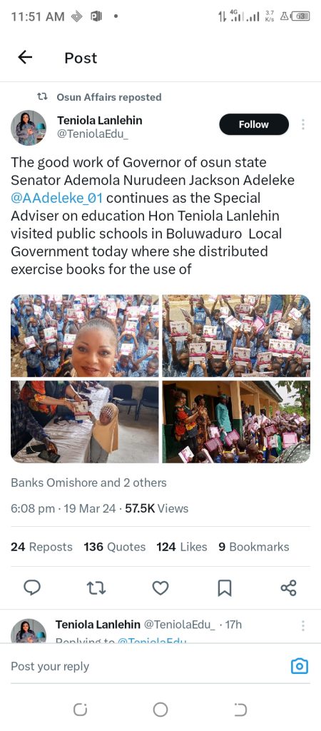 Sharing about the programme accompanied with pictures on X (formerly twitter) Hon. Teniola wrote; “The good work of Governor of osun state Senator Ademola Nurudeen Jackson Adeleke @AAdeleke_01 continues as the Special Adviser on education Hon Teniola Lanlehin visited public schools in Boluwaduro Local Government today where she distributed exercise books for the use of students/pupils and the teachers. She encouraged the teachers to discharge their duties diligently and see the children under their care as the leaders of tomorrow. She also advised the pupils and students to be hardworking .