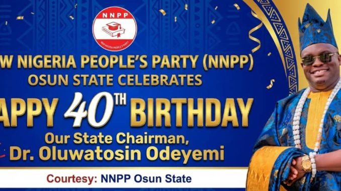 The New Nigeria People’s Party (NNPP), Osun State Chapter, has joined family, friends, and well-wishers to celebrate its Chairman, Dr. Oluwatosin Odeyemi, on the occasion of his 40th birthday.