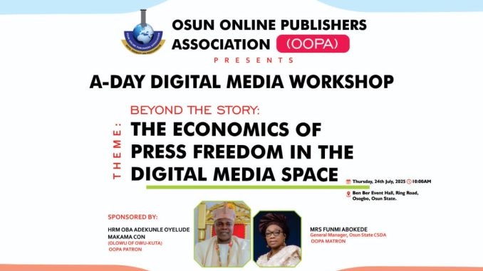 In a bold step toward repositioning the practice of journalism for the digital age, the Osun Online Publishers Association (OOPA), has announced a one-day digital media workshop: “Beyond the Barrier: The Economics of Press Freedom in the Digital Media Space” for its members.