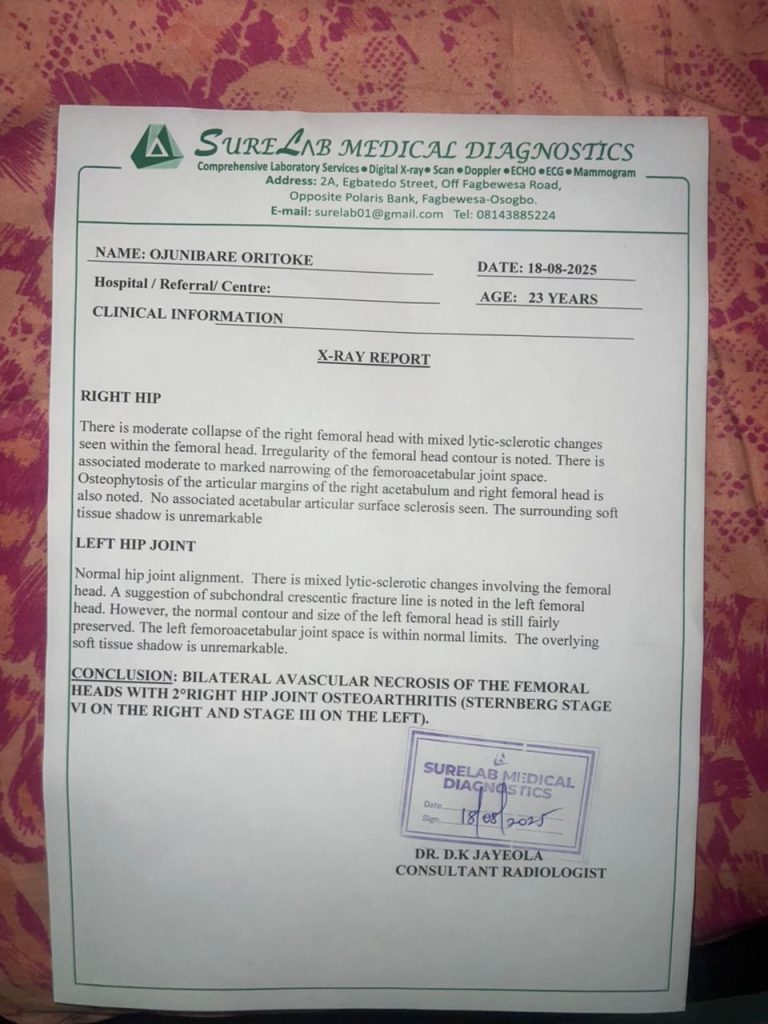 “I recently had an X-ray and the orthopedic doctor informed me that my right leg bone is damaged, requiring surgery that costs ₦3.5 million.”