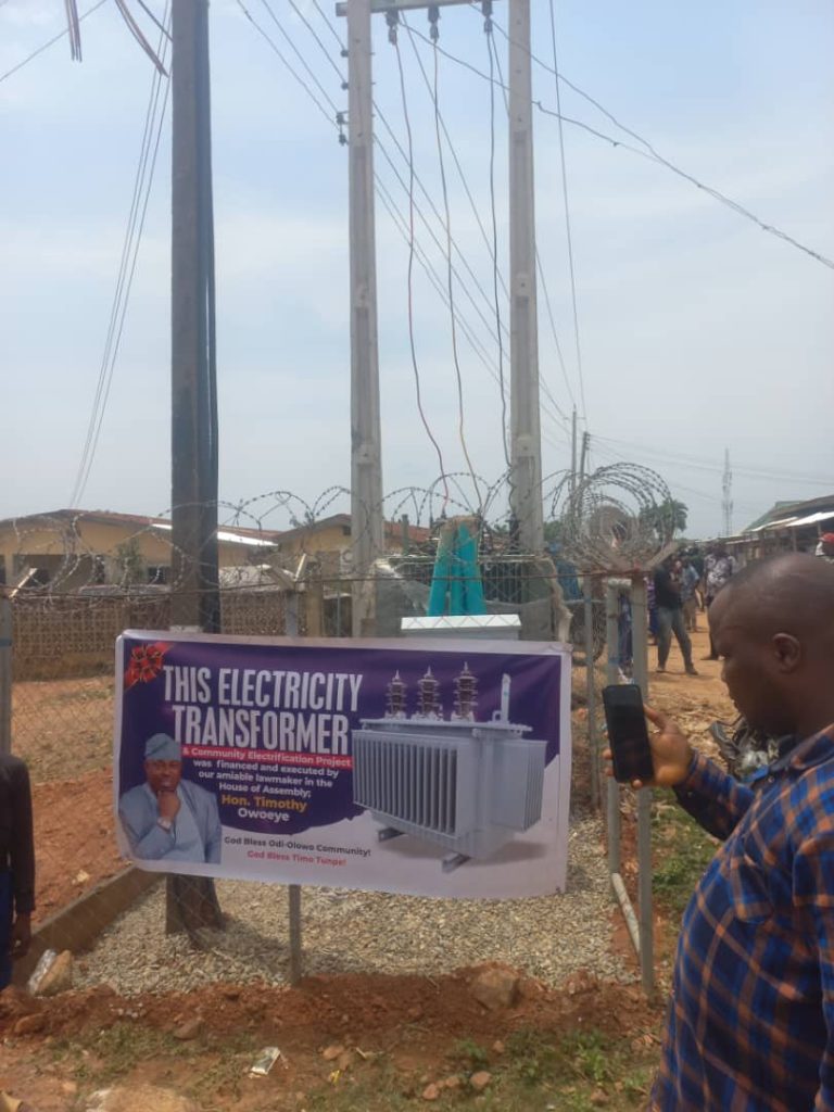 In furtherance of his contribution to the development of the society and Constituency, the Speaker of the Osun State House of Assembly, Rt. Hon. Timothy Oweye has donated 300KVA electricity transformers to Odi-olowo and Oke-Aga community in Ilesa East Local Government.