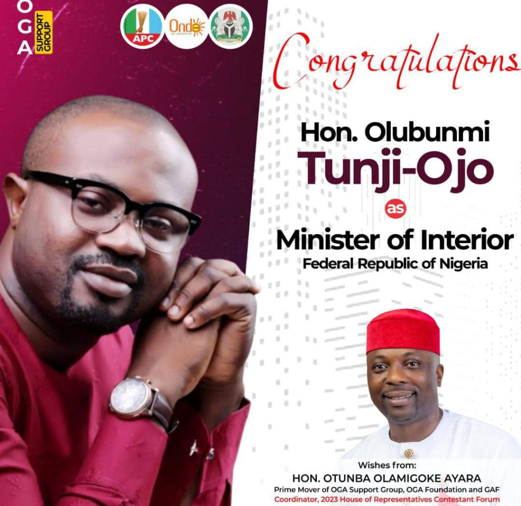 Otunba Olamigoke Ayara has congratulated Hon. Olubunmi Tunji-Ojo, on his appointment, confirmation and swearing-in as the Minister of Interior.