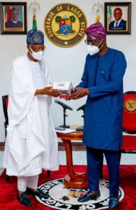 Minister of Information and Culture, Alhaji Lai Mohammed presenting Set-Top-Box to Lagos State Governor, Mr Babajide Sanwo-Olu, during the Ministry’s Taskforce on Digital Switch Over’s courtesy visit to the governor at the Lagos House, Marina, on Saturday, April 17, 2021.