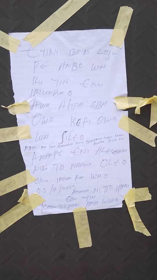 In the note written in Yoruba language, the suspects claiming to be robbers, asked residents to be prepared as they were coming to roby before the end of October.