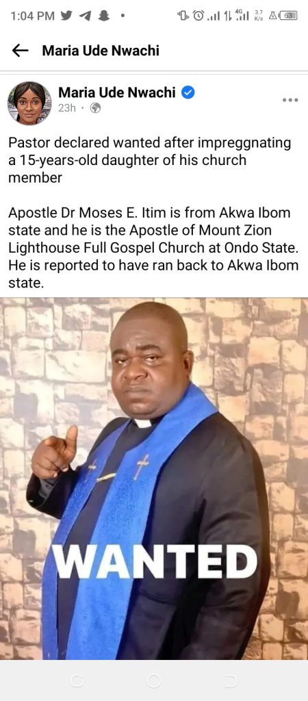 Apostle Dr Moses E. Itim has been declared wanted for allegedly impregnating a 15 year old Daughter of Church member in Ondo State.