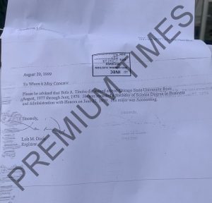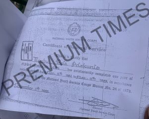 Stating his occupation as “POLITICIAN,” the 70 years old APC National Leader claimed he obtained a B.Sc degree in Business and Administration from Chicago State University on June 22, 1979 before participating in the compulsory national youth service from November 12, 1982.