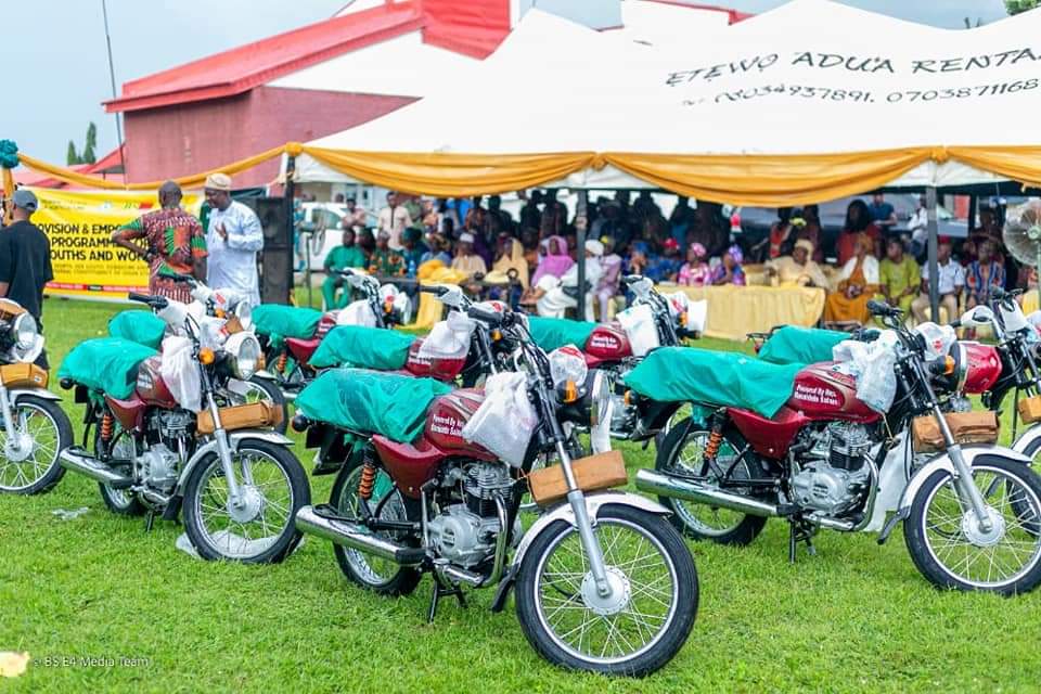 Tablets were distributed to some persons, while other empowerment items were industrial sewing machines, manual sewing machines, freezers, motorcycles, generators, hair dryers, grinding machines, knapsack sprayers, and cash grants.