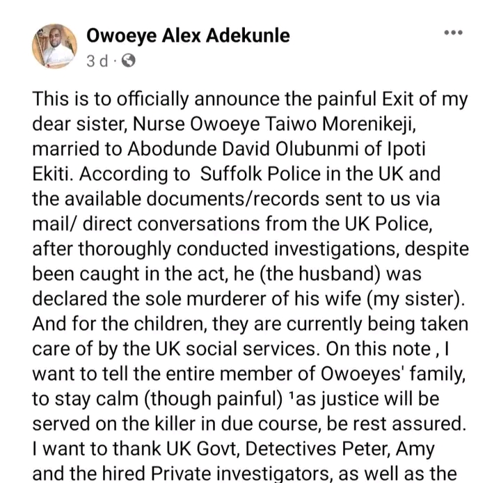 The brother of the deceased revealed on Facebook that the Suffolk police said his sister’s husband is the sole suspect in her death.