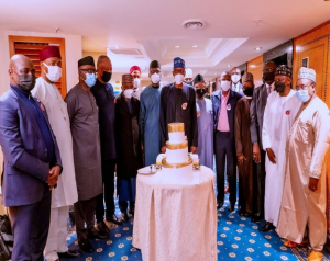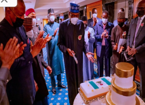 Photos shared by a presidential aide, Buhari Sallau, showed the moment the President cut his birthday cake with the national colors, green-white-green.