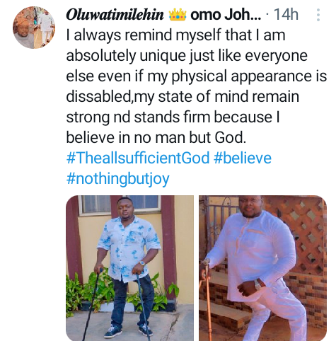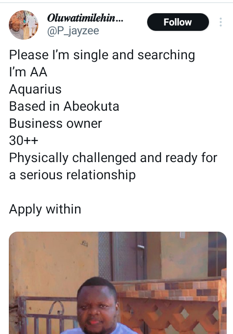 Physically challenged Nigerian man, Oluwatimilehin, has slammed people mocking him for seeking a serious relationship online.