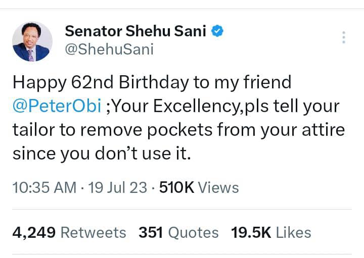 Shehu Sani tweeted; “Happy 62nd Birthday to my friend @PeterObi ;Your Excellency,pls tell your tailor to remove pockets from your attire since you don’t use it.”