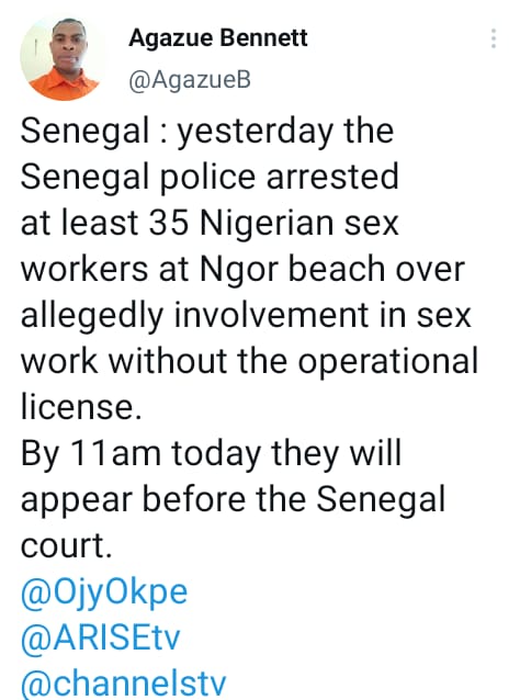Senegal police have reportedly arrested 35 suspected Nigerian s3x workers for operating without license.