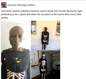 According to a Zimbawean Facebook user, General Chiwenga Wisdom, who posted the photos on Thursday, May 26, the suspect specialises in breaking into houses during the night wearing a skeleton costume and pretending to a ghost.