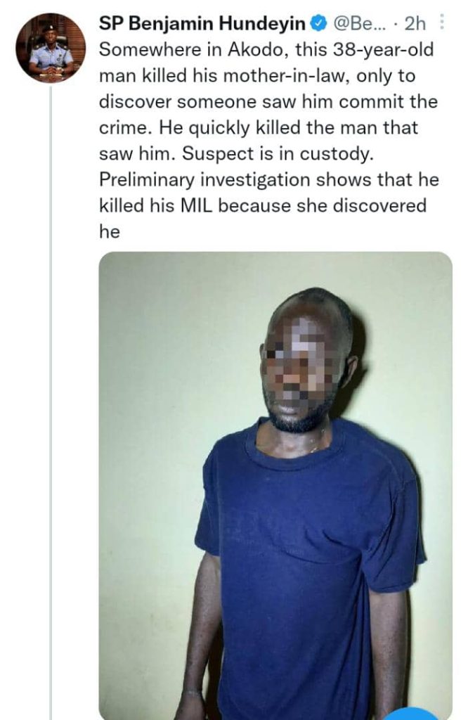 Hundeyin said the suspect further killed a man who witnessed him committing the crime.