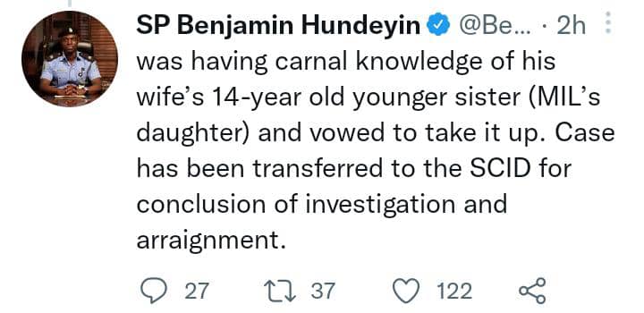 The spokesperson of the state police command, SP Benjamin Hundeyin, who disclosed this on social media, said preliminary investigation shows the suspect killed his mother-in-law after she caught her having sex with her 14-year-old daughter.