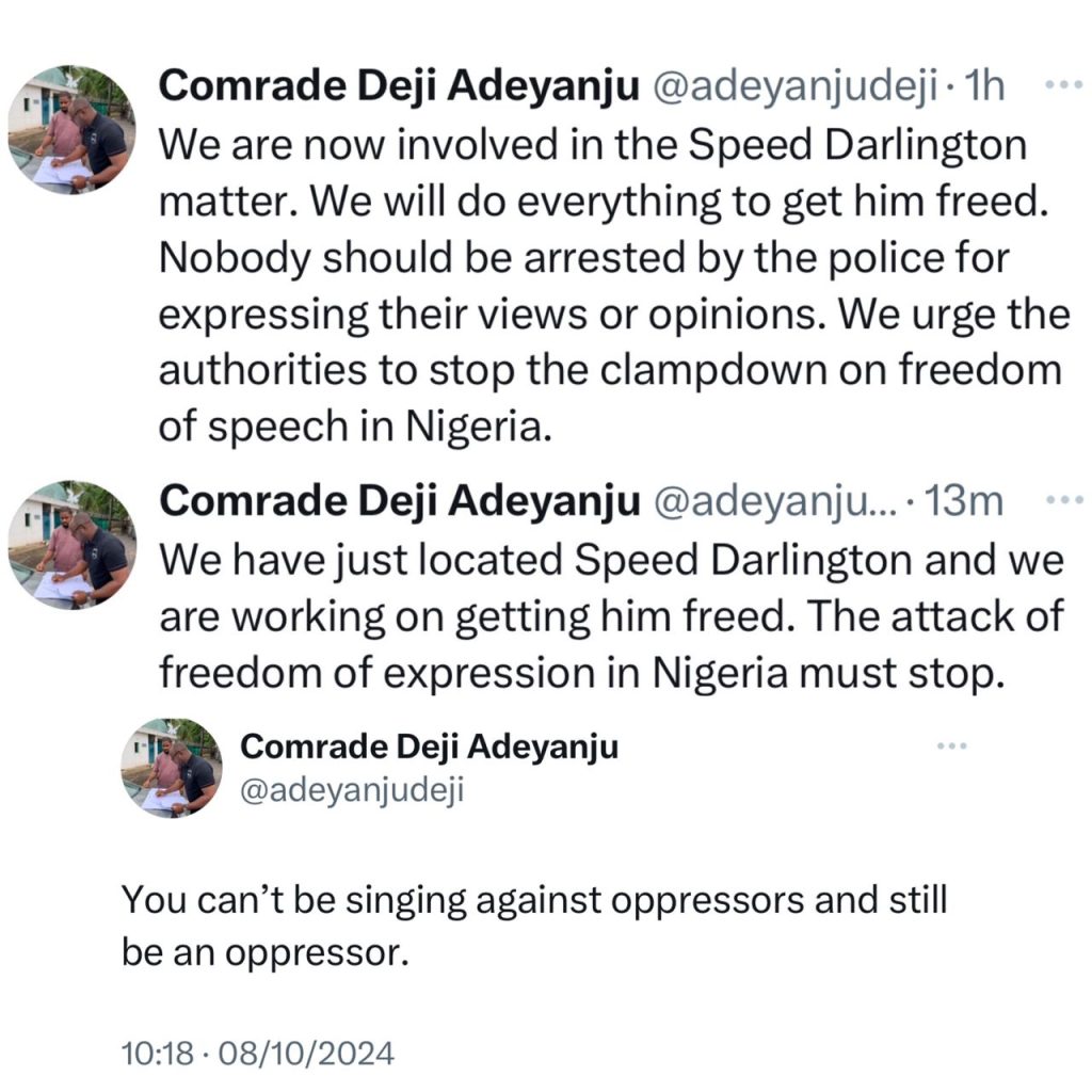 He stressed that no one should be arrested by the police for expressing their views. As of now, no one knows who certainly facilitated Darlington’s arrest. However, in his post, Deji wrote;