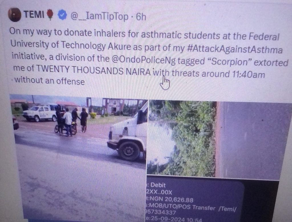 The victim, Temi (@_iamTipTop) in a deleted X post on Wednesday, September 25, 2024, said he was on his way to donate inhalers to asthmatic students at the Federal University of Technology Akure when the police officers extorted the money from him with threats.
