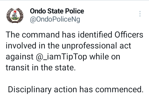“The command has identified Officers involved in the unprofessional act against @_iamTipTop while on transit in the state. Disciplinary action has commenced,” the statement read.