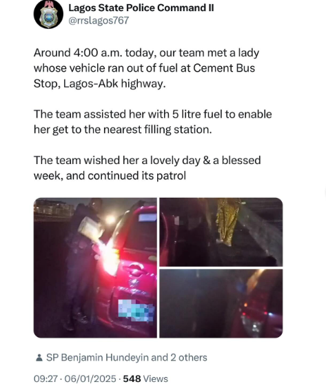The Lagos state police command is getting commendations from Nigerians after rescuing a stranded lady whose vehicle ran out of fuel while she was driving at about 4am today January 6.
