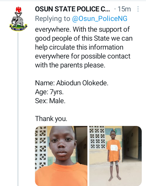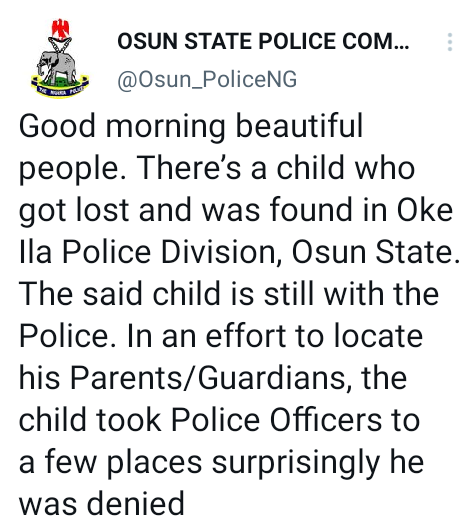 “There’s a child who got lost and was found in Oke Ila Police Division, Osun State. The said child is still with the Police. In an effort to locate his Parents/Guardians, the child took Police Officers to a few places, surprisingly he was denied everywhere,” the statement say.