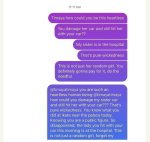 “This celebrity and how they behave. @timaya nearly killed my sister this morning. She hit her with his car and run. At Ikate few hour ago, he hit my sister car and she came down to ask him to look what he did, this heartless human was asking for number and she told him he would block her, rather for @timayatimaya to do the needful. He hit my sister with his car and ran away. She is at the hospital right now in serious pain and funniest part is me messaging him on Instagram to do the needful but this needless fellow blocked me after reading my message.”