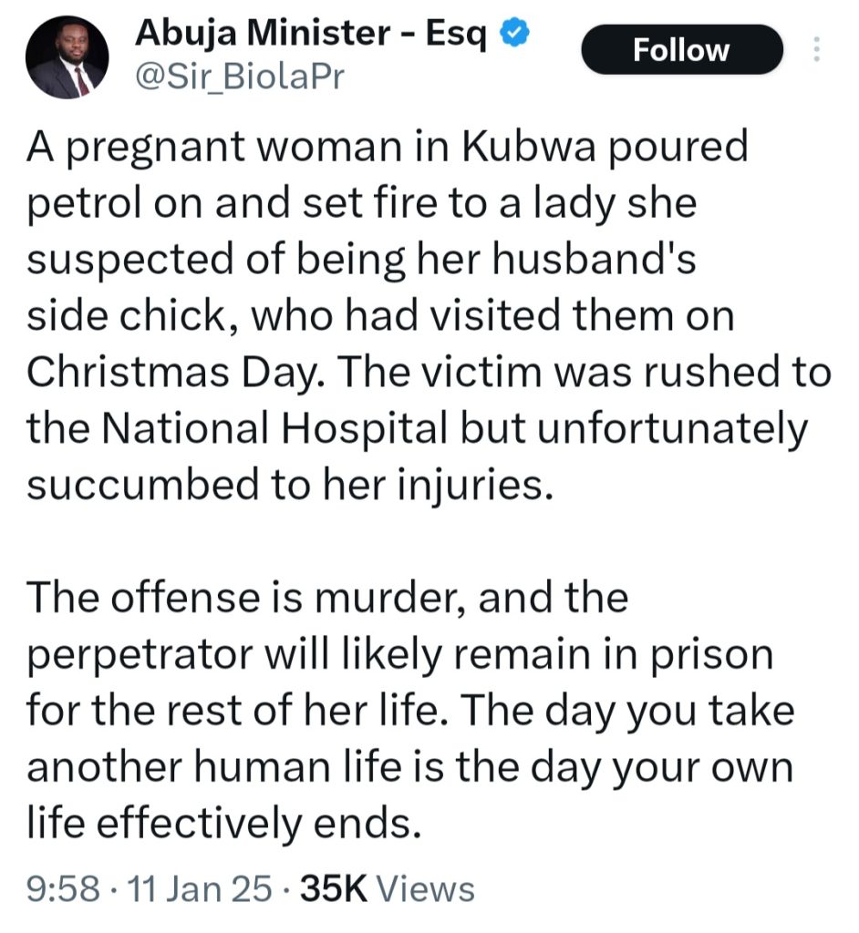 According to a lawyer who narrated the story on X, the victim visited the couple on Christmas Day in 2024 and the man’s pregnant wife allegedly poured petrol on her and set her ablaze.
