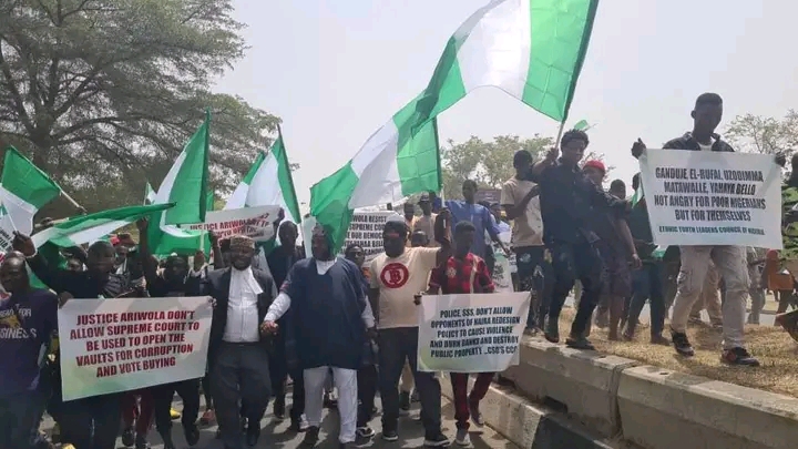 The protesters carried placards with inscriptions such as, ‘Justice Ariwoola, resist plot to use our Supreme Court undermine democracy,’ accused the Chief Justice of Nigeria, Olukayode Ariwoola, of allegedly working for the interest of the All Progressives Congress, its presidential candidate, Bola Tinubu and G5 governors.