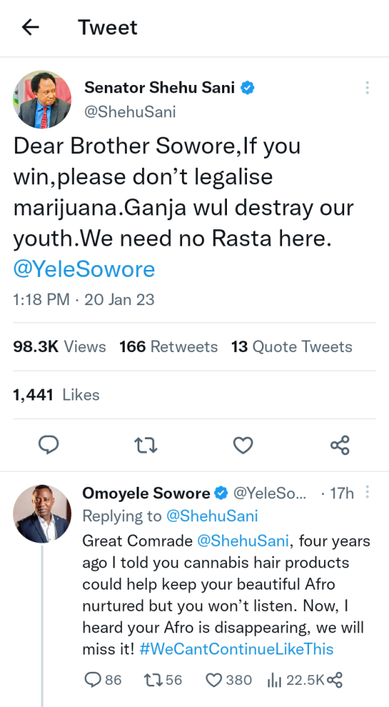 Sowore responded to his tweet by saying, “Great Comrade @ShehuSani, four years ago I told you cannabis hair products could help keep your beautiful Afro nurtured but you won’t listen. Now, I heard your Afro is disappearing, we will miss it.”