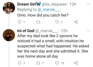 She said the girl, who is yet to turn 10, poured “one of those sniper like chemicals” into her parents’ beverage and her dad noticed the strong smell after taking some spoons.