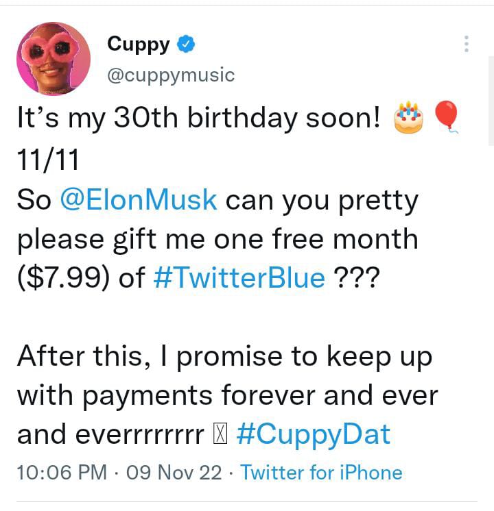 “So @ElonMusk can you pretty please gift me one free month ($7.99) of #TwitterBlue ???.