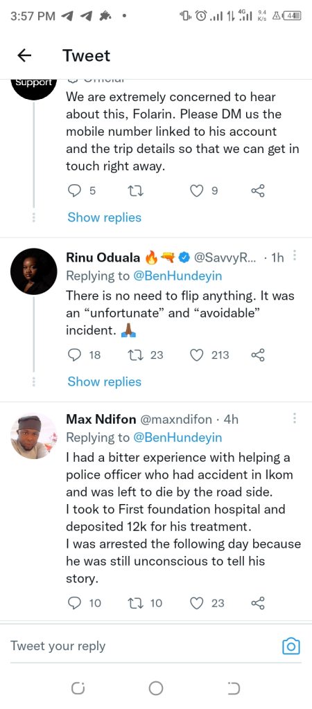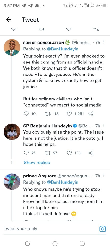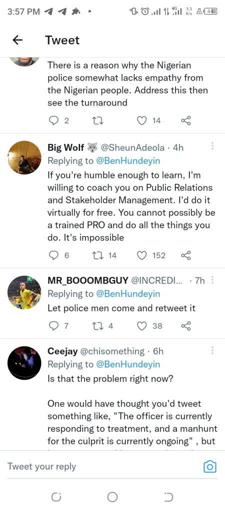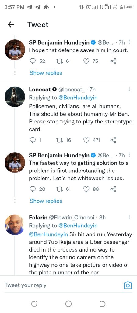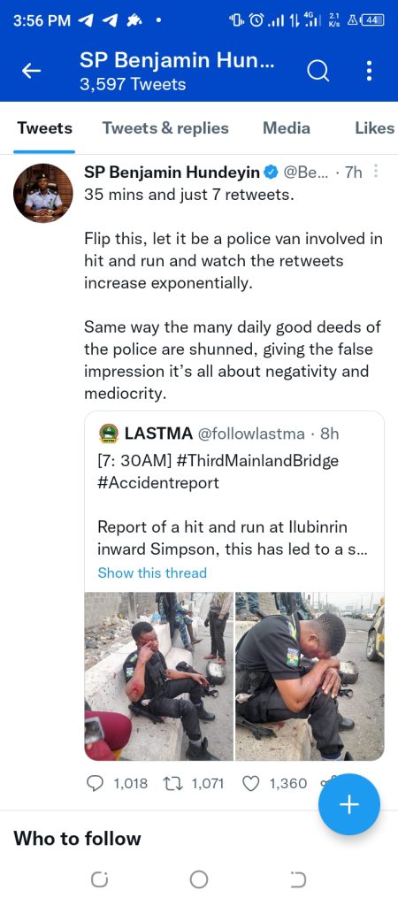 Reacting to this, the Lagos State Police Public Relations Officer, Benjamin Hundeyin on Twitter wrote, “35 mins and just 7 retweets. Flip this, let it be a police van involved in hit and run and watch the retweets increase exponentially.