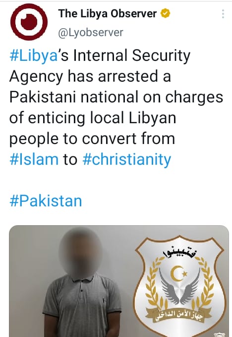 Libya’s Internal Security Agency has arrested a Pakistani national on charges of enticing local Libyan people to convert from Islam to Christianity.