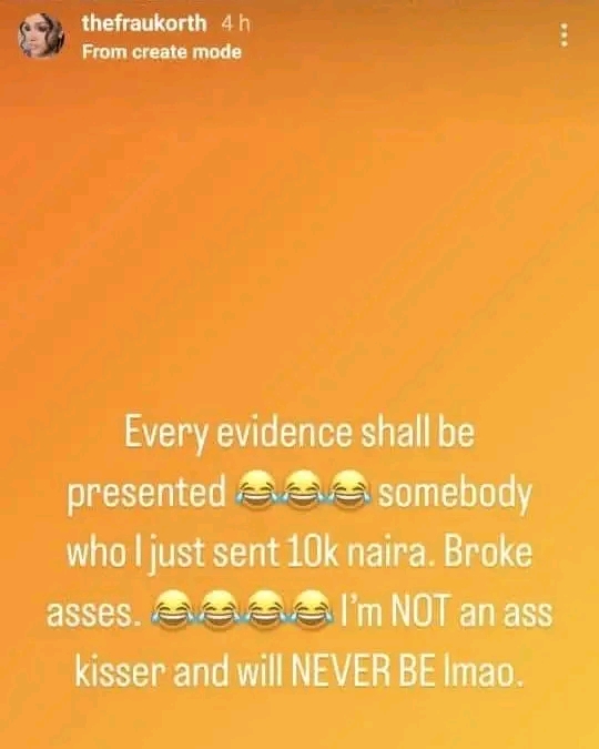 Every evidence shall be presented. Somebody who I just sent 10k naira. Broke asses. I’m NOT an ass kisser and will NEVER BE lmao.