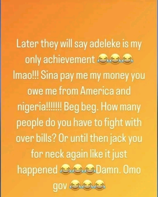 Later they will say Adeleke is my only achievement. Lmao!!! Sina pay me my money you owe me from America and Nigeria!!! Beg beg. How many people do you have to fight with over bills? Or until then jack you for neck again like it just happened. Damn Omo gov.
