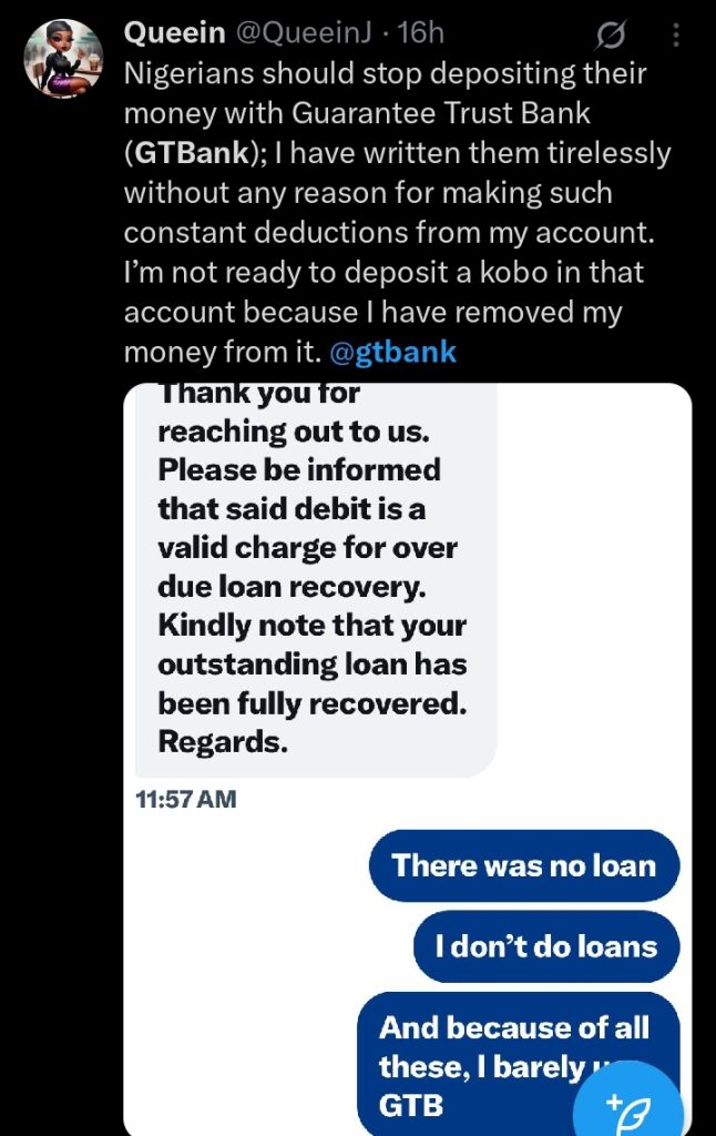 Queein (@QueeinJ) echoed this sentiment, criticizing GTBank for unexplained deductions from her account.