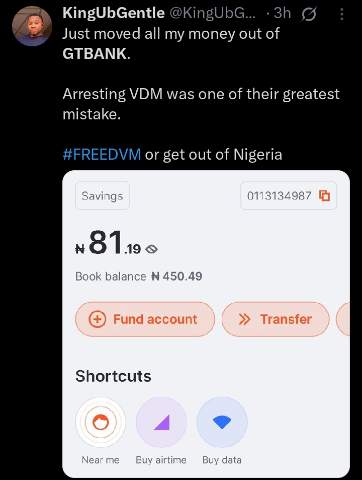 KingUBGentle (@KingUBG) also announced moving his money out of GTBank, calling VeryDarkMan’s arrest a mistake.
