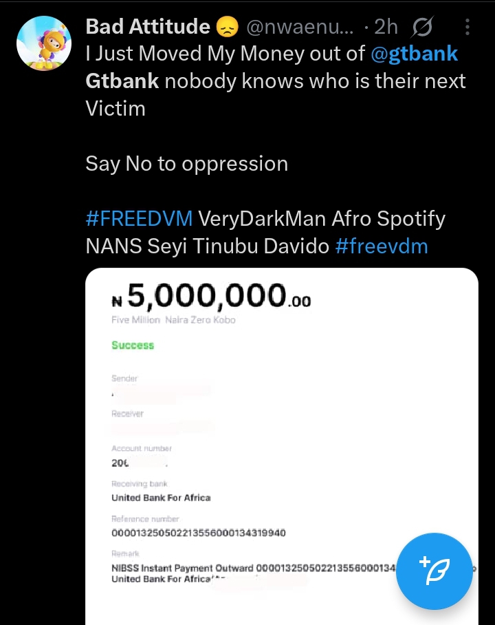 Bad Attitude (@nwaenu) confirmed moving ₦5,000,000 out of GTBank to United Bank for Africa, stating that GTBank could be the next victim of public backlash. The #FREEDVM hashtag continues to trend, amplifying the call to action.