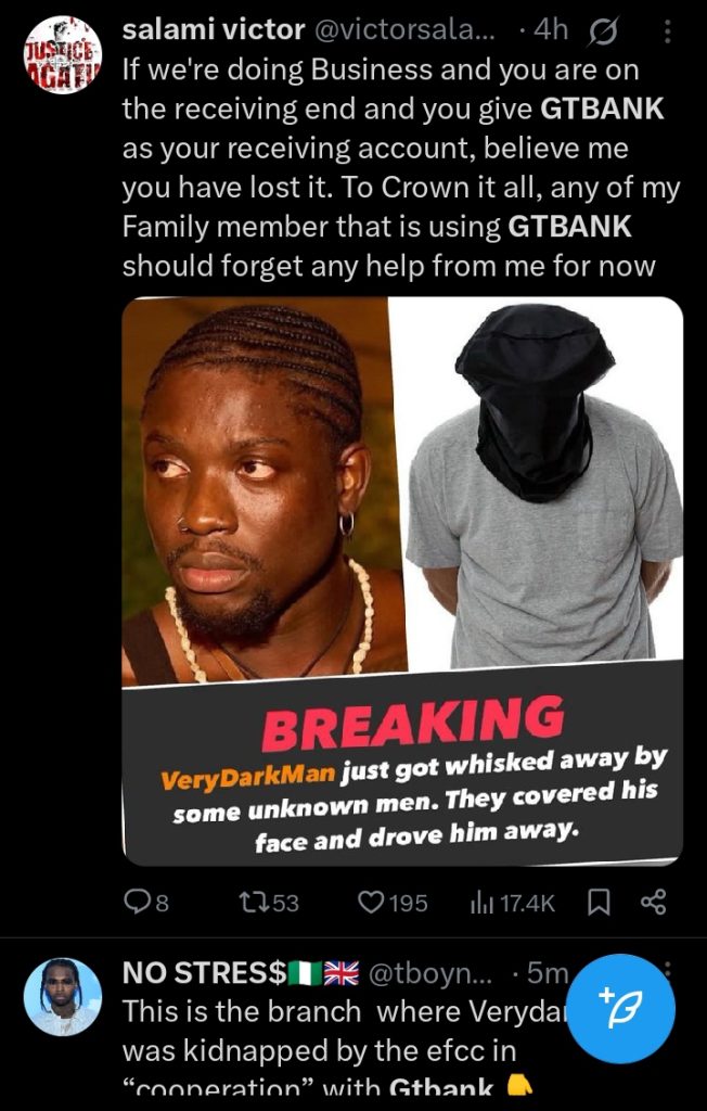 Salami Victor (@victorsala) took a firm stance, refusing to do business with anyone using GTBank accounts. He shared reports of VeryDarkMan being whisked away by unknown men, fueling further outrage and calls for accountability from GTBank and the EFCC https://amiloadednews.com/student-reportedly-fakes-mothers-death-to-scam-schoolmates-of-millions/