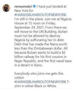 Nigerian human rights activist, Reno Omokri, is currently in New York, United States of America for #HARASSBUHARIOUTOFNEWYORK movement. #HARASSBUHARIOUTOFNEWYORK is a movement which he initiated with the goal to harass the Nigerian President, Gen. Muhammadu Buhari who is currently in New York for the 76th United Nations General Assembly. Reno Who announced his arrival urged Nigerians in New York to join him at the Nigeria House at 12 noon on Friday 24th September, 2021. He has promised to issue out customized T-shirts to those who would join him in the #HARASSBUHARIOUTOFNEWYORK movement. He wrote: From there we will move to the UN Building. Buhari must not be allowed to destroy Nigeria by suffocating her in debt. Debt that has made the Naira worth less than the Zimbabwean dollar. All because Buhari wants to build a $2 billion railway for his first cousins in Niger Republic, and the first naval base in a desert in Kano. Everybody who joins me gets this cotton #HARASSBUHARIOUTOFNEWYORK T-shirt in either Black or White.” ![]() |