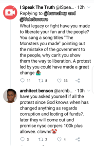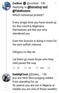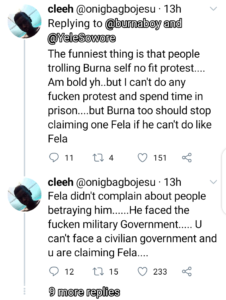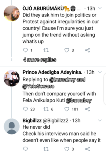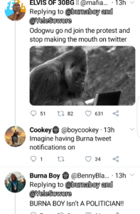 “Hello @burnaboy, everywhere I turn, people describe you as a revolutionary musician, the foreign media even celebrate you, compare you to Fela Kuti, but I am yet to see you lead anyone to a police station carrying a coffin for head of state! Join #Oct1stProtest #RevolutionNow,” he tweeted.
